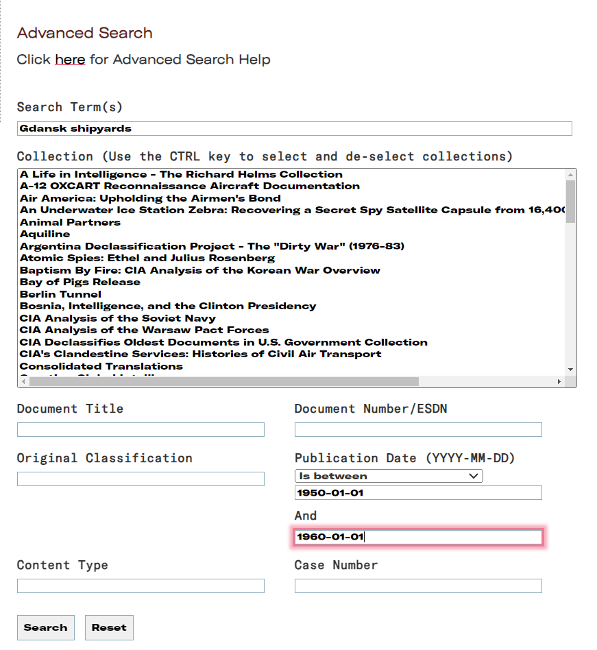 Pod adresem https://www.cia.gov/readingroom/advanced-search-view znajduje się wyszukiwarka zaawansowana, dzięki której możemy określić zakres kategorii czy interesujące nas daty powstania dokumentów. To bardzo przydatne, jeśli chcemy dopasować dokumenty do konkretnych wydarzeń historycznych, czy okresów, w których, powiedzmy, pracował tam ktoś z naszej rodziny.