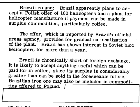 Brazylia potwierdziła, że przyjmie polską ofertę na dostawę 100 helikopterów i warsztatu mechanicznego, jeśli płatność będzie mogła być uiszczona w dobrach luksusowych, głównie kawie. [źródło]