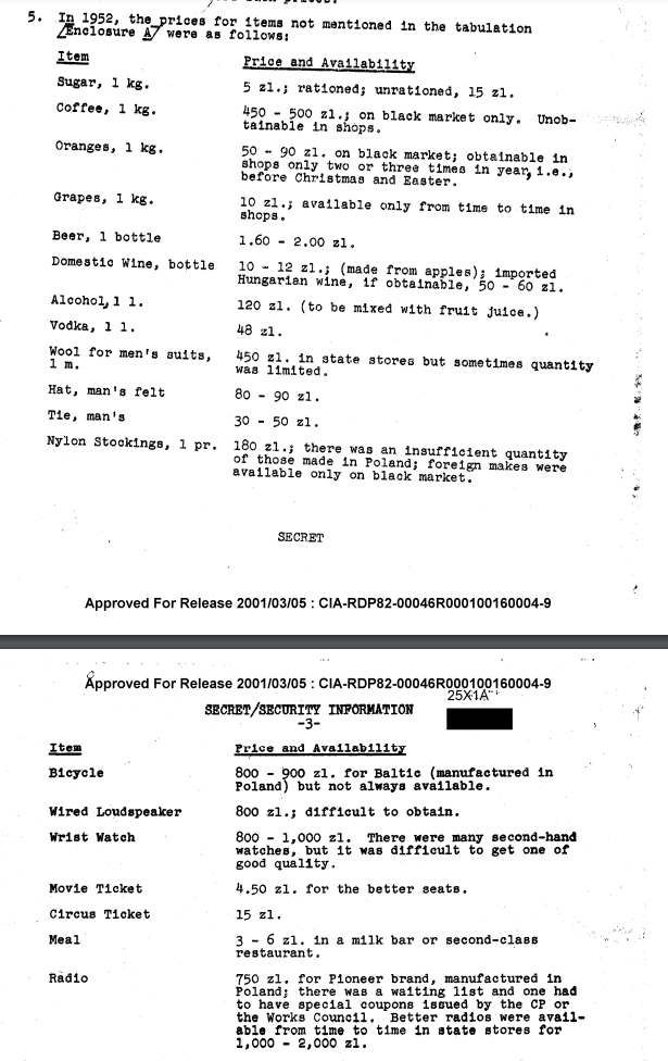 W 1952 r. w Szczecinie piwo kosztowało 2 zł, obiad 6 zł, a kilogram pomarańczy nawet 90 zł, o ile oczywiście były dostępne. Zupełnie niedostępna w sklepach była kawa, którą na czarnym rynku można było kupić za 450-500 zł za kilogram. Dwa kilogramy kawy wystarczyłyby, żeby kupić nowy rower 800-900 zł. Męski kapelusz to 90 zł, krawat – 50 zł, ale jedna para pończoch, to koszt aż 180 zł.