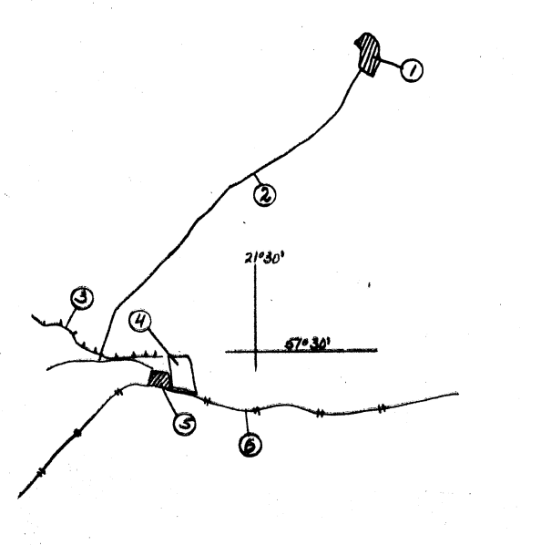 Mapa pokazująca umiejscowienie fabryki materiałów wybuchowych (4) w Pionkach (5) z dojazdem (2) od strony Kozienic (1), linią kolejową dwutorową (6) do Dęblina i wąskotorówką (3) kolei leśnej. [źródło].
